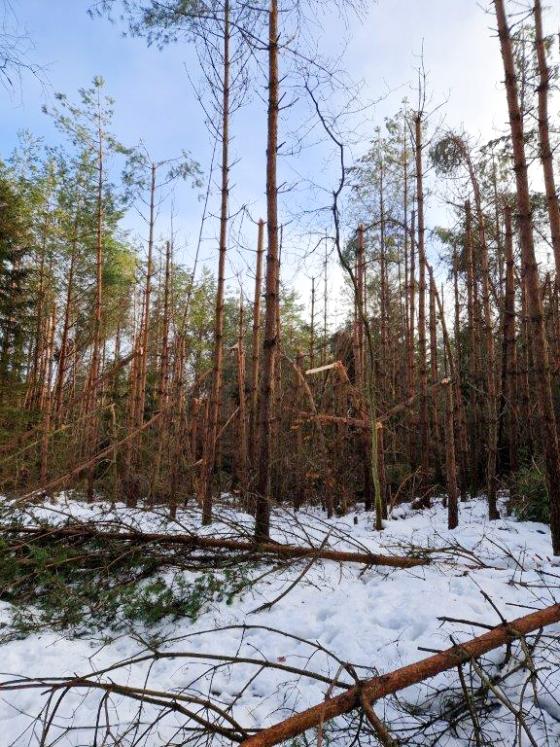 Gruba warstwa ciężkiego (mokrego) śniegu spowodowała złamanie gałęzi i bardzo wielu całych koron – części górnych drzew. W lesie zalega bardzo dużo gałęzi, złamanych części lub całych koron. Uszkodzone, złamane fragmenty mogą być zawieszone, oparte na innych drzewach. Wiele dróg leśnych jest zablokowana.
