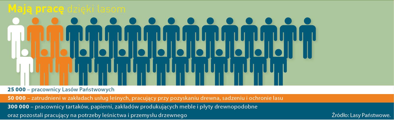 Lasy Państwowe należą do czołówki największych pracodawców w Polsce. Ale las i drewno zapewniają też utrzymanie pracownikom kilku tysięcy prywatnych zakładów usług leśnych, którzy na zlecenie zajmują się m.in. sadzeniem drzew i ich pielęgnacją, pozyskaniem drewna i jego wywozem, a przede wszystkim osobom zatrudnionym w kilkudziesięciu tysiącach firm tworzących przemysł drzewny, meblarski, papierniczy. W sumie to aż 375 tys. Polaków. Statystycznie co setny mieszkaniec naszego kraju pracuje w sektorze związanym z leśnictwem i przetwórstwem drewna.